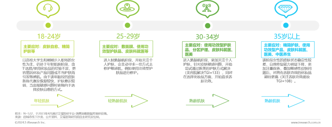 年轻肌肤自我修复能力强,自愈解决为主;25岁进入轻熟龄肌,尝试使用功效型产品改善敏感;30岁之后的熟龄肌更加注重保养,如做医美、使用养肤产品。