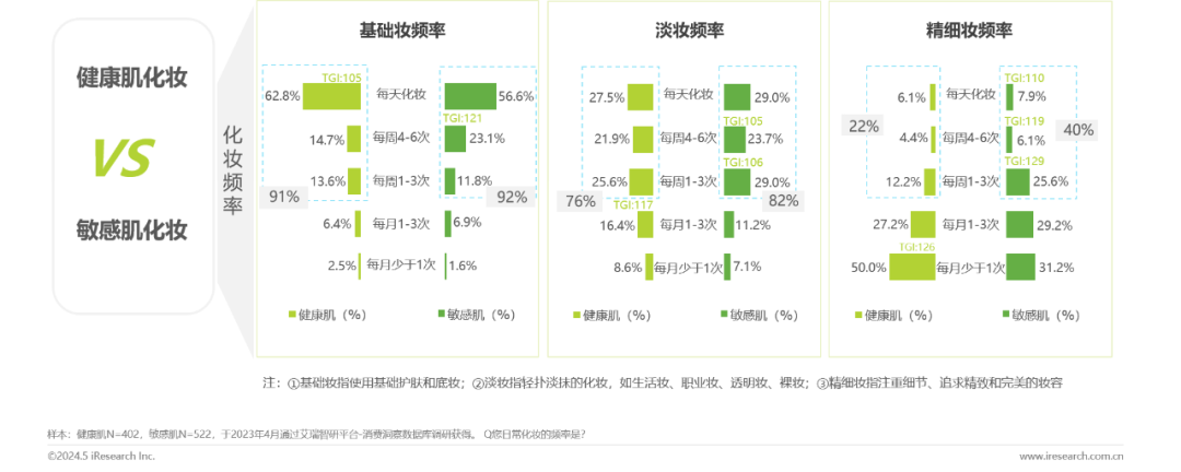 相比健康肌人群,敏感肌人群更希望用化妆来呈现好的状态,其基础妆、淡妆与精细妆的频率均高于健康肌,尤其偏爱精细妆。