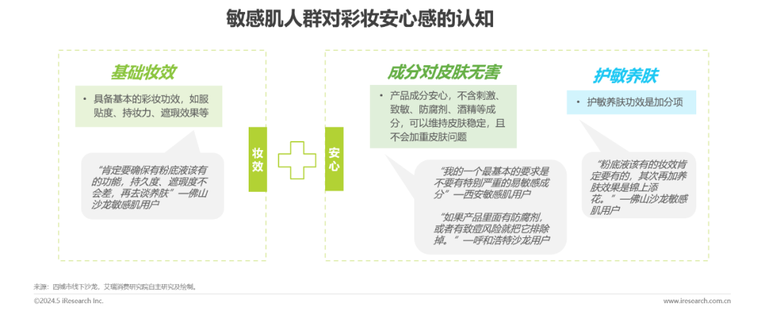 敏感肌人群认为适敏彩妆具备服贴、持妆、遮瑕等基础彩妆功效的同时,成分也要天然安心,不会加重敏感症状,如果适敏彩妆做到护敏养肤更是加分项。