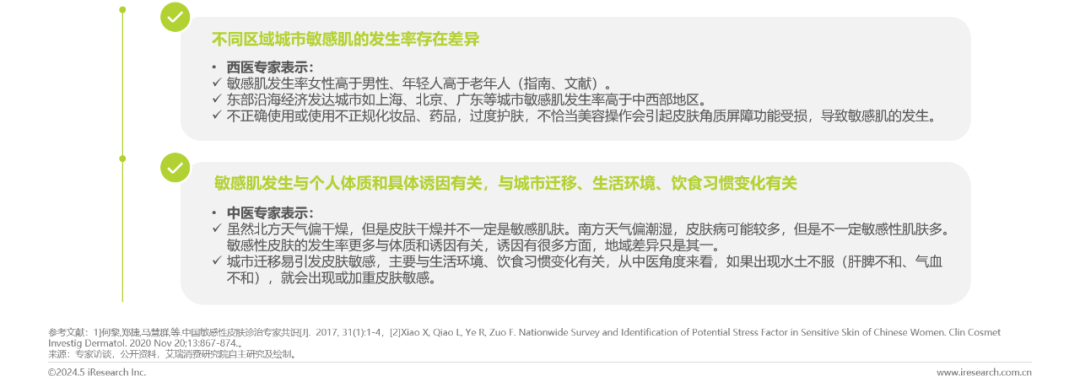 西医角度,敏感性皮肤是在皮肤屏障功能受损后引起的皮肤炎症反应;中医角度,敏感性皮肤主要与表虚体质复感有关;
