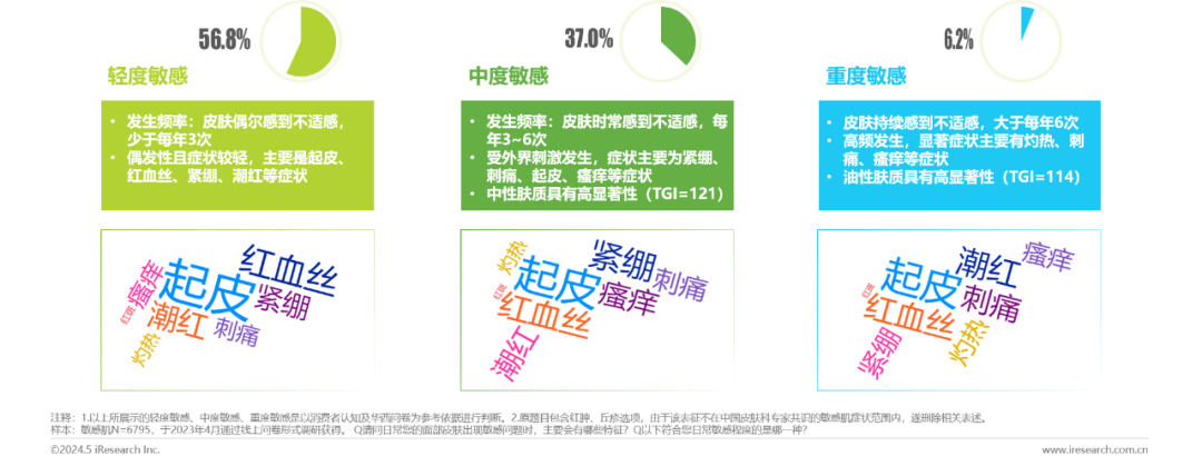56.8%为起皮、红血丝、紧绷、潮红等轻度敏感症状