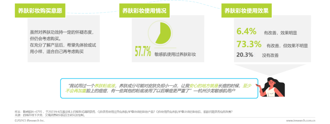 57.7%敏感肌人群用过有养肤功效的彩妆,其中近八成有改善