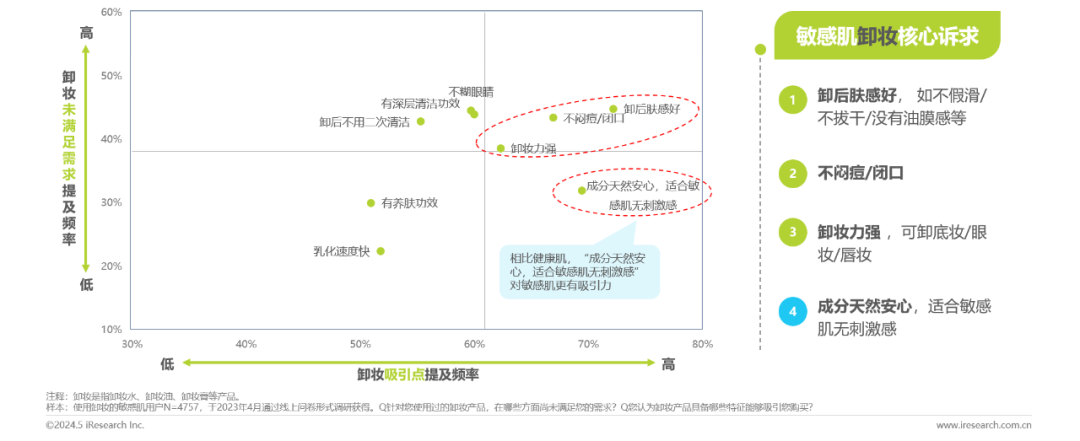 除卸后肤感、卸妆力等基础功效外,敏感肌人群更希望拥有一款不闷痘/闭口、成分天然安心的卸妆产品。