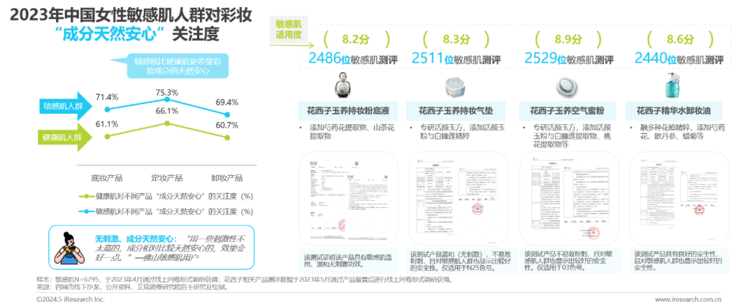 敏感肌人群相对健康肌人群对彩妆产品的要求更高,花西子相关测评产品成分天然、温和不刺激,通过第三方检测机构及用户测评数据结果显示敏感肌适用度高。