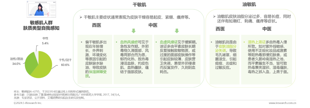 西医专家认为干敏肌更多缺水缺油,易干燥起皮、瘙痒等,油敏肌皮肤油脂分泌过多,易长痘、刺痛等;中医专家表示干敏肌通常是血热或血虚,容易出现干燥起皮、紧绷,而油敏肌通常是湿热上蒸,容易出现潮红、刺痛。