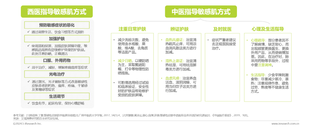 西医以预防、护肤、药物、光电、生活调节等方式修护敏感肌,中医应对敏感肌强调整体调节;