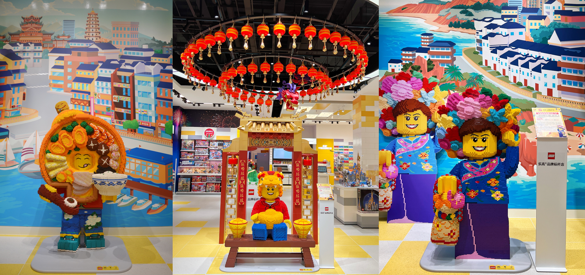 这家店里以福州半山半海的地貌特征为灵感,设计了一座“山海画廊”并陈列了以福建非物质文化遗产为灵感而设计的3D乐高人仔模型佛跳墙仔、蟳蜅女孩与板凳龙仔——这些并不是简单的拼接,而是最大程度地通过乐高积木还原当地不同领域文化的细节。