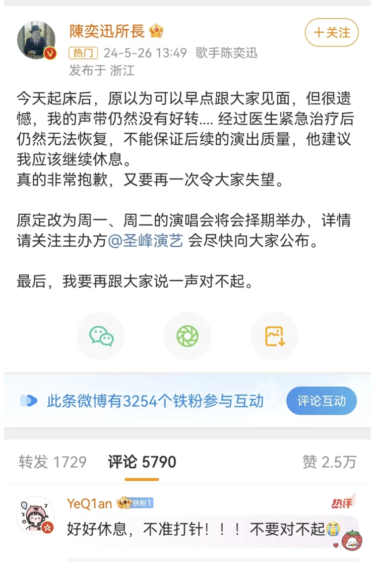 5月25日晚,陈奕迅在痛苦中登台,此时观众已等待演唱会开演多时。陈奕迅坦言因声带不适,无法继续演唱,不得不取消当晚的演唱会,并将演出延期至下周一下周二。