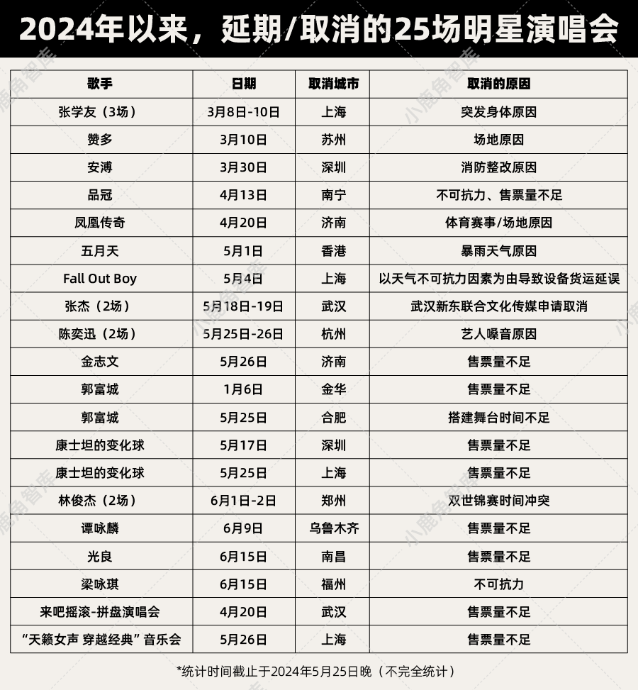 据小鹿角智库不完全统计,2024年以来,至少有25场演唱会在开演前取消,除了极少数撞期体育赛事、暴雨天气或者突发身体不适等不可抗力因素之外,大多数演唱会都是因为售票情况不佳而无奈选择了取消。