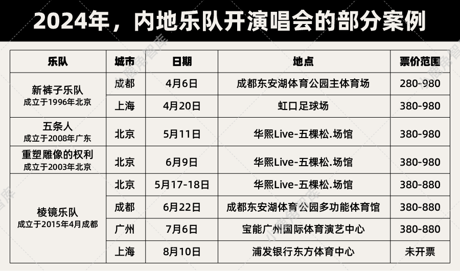 事实上,这些年,随着独立音乐的普及,越来越多的乐队开始尝试从Livehouse进入体育馆,甚至体育场,成为活跃在演唱会市场上的一支新生力量,但开专场的观众规模预期和实际售票速度都在降低。