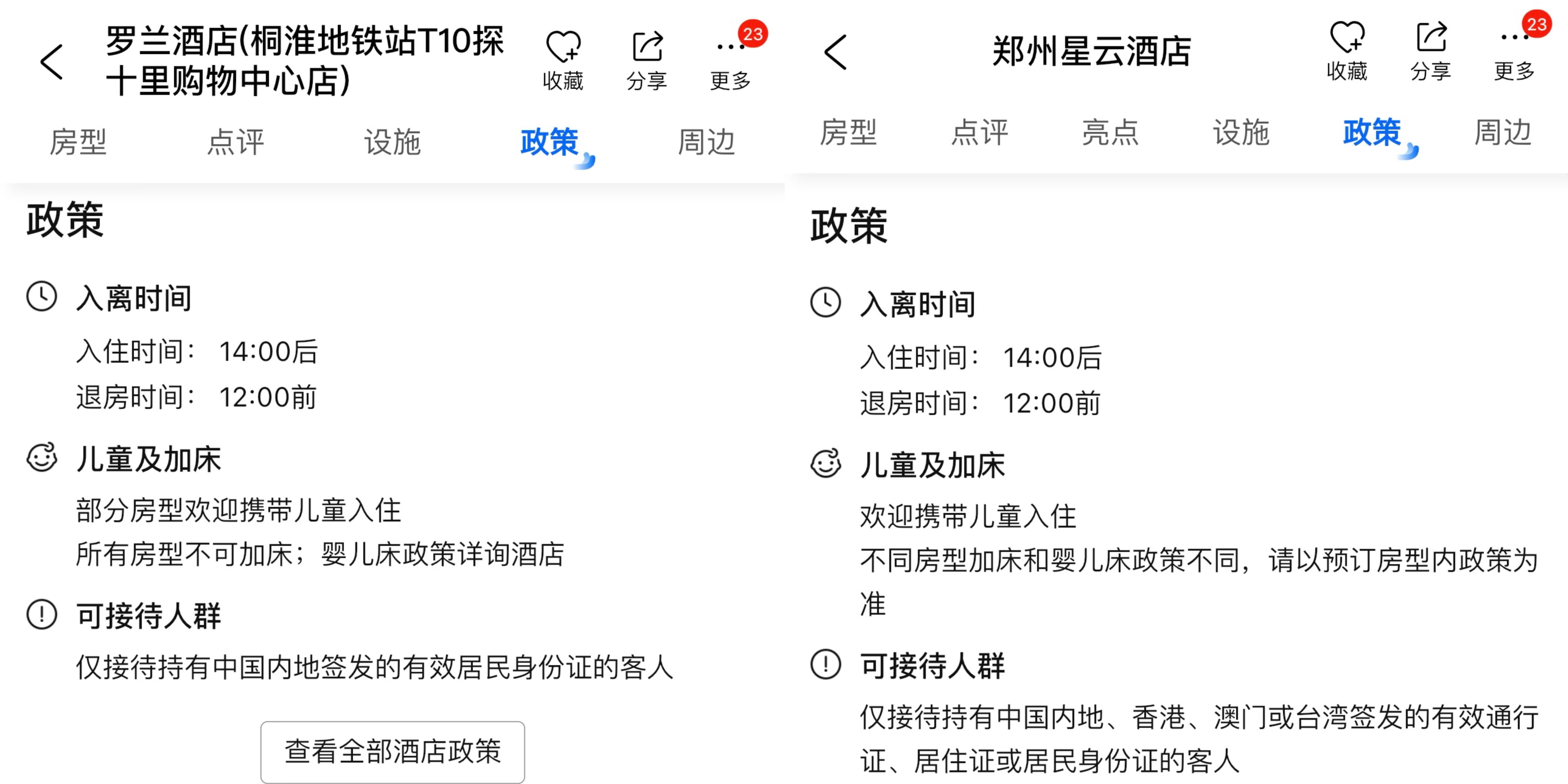 而在非一线城市,不接待外宾的酒店数量有明显增多。以郑州为例,界面新闻先后搜索到全季酒店(郑州中原万达广场二砂地铁站店)、罗兰酒店(桐淮地铁站T10探十里购物中心店)、希尔曼酒店(大学南路荆胡商业中心店)以及郑州星云酒店等多家酒店,政策中注明“仅接待中国内地客人”或者“仅接待中国内地及港澳台客人”,而把外宾排除在外。