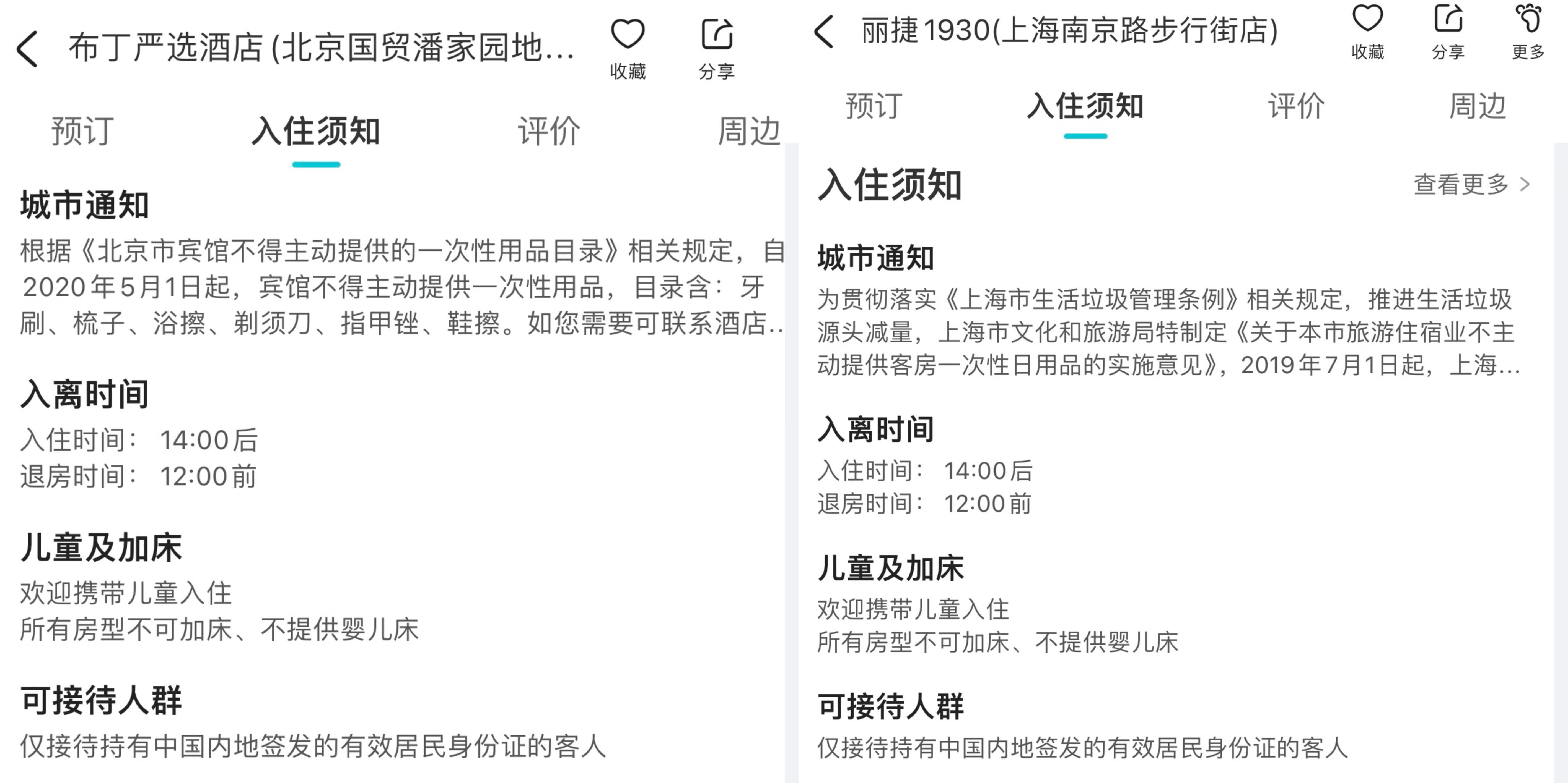 分不同类型城市看,在北京、上海等一线城市,绝大部分酒店均显示可接待来自任何国家和地区的客人,只有个别酒店不接待外国旅客。如布丁严选酒店(北京三里屯团结湖店)、布丁严选酒店(北京国贸潘家园地铁站店)、丽捷1930(上海南京路步行街店)等几家酒店,均显示“仅接待有中国内地签发的有效居民身份证的客人”。
