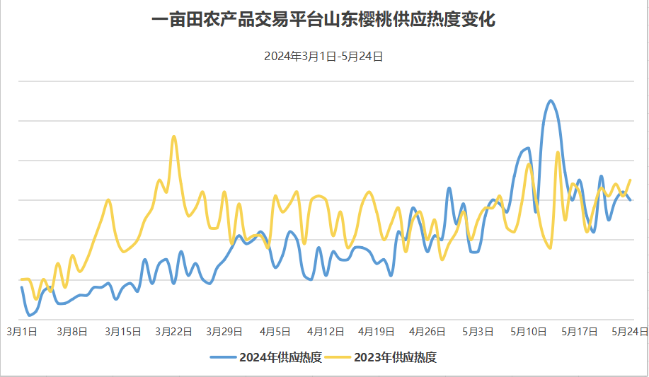 欧连维表示,从一亩田平台的供应热度趋势看,到了5月份,产地整体卖货热情比往年同期要高很多,可见虽然上市时间发生了变化,但不影响今年又是一个樱桃的丰收年份。