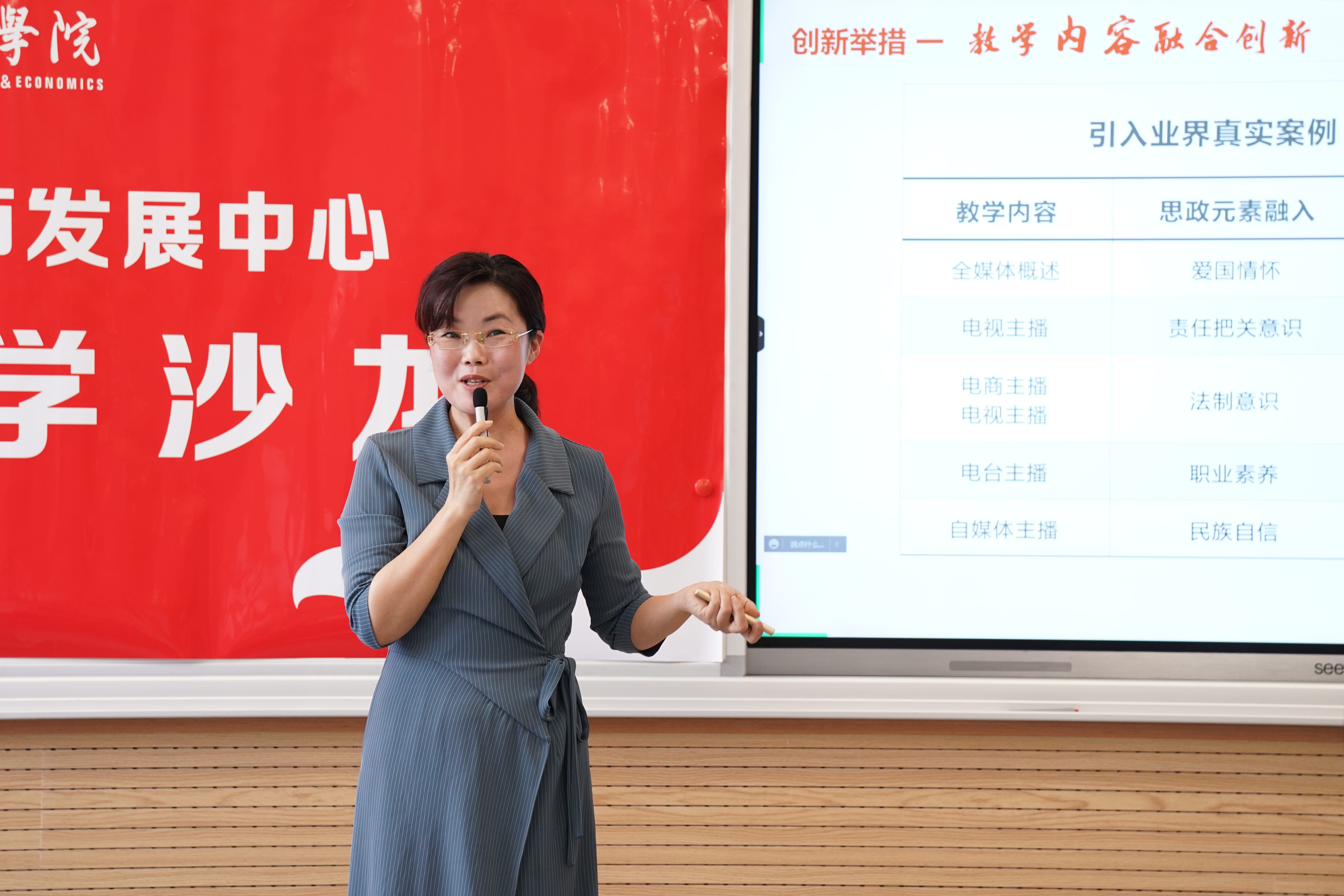 面对数字媒体冲击,人人都有麦克风的传播格局下,该团队以影视为背景,财经为特色,回归传播本质,引入业界真实案例、真实项目和一线导师,构建电视、广播、报网、电商直播等“多元场景”,实现教学模式融合创新。
