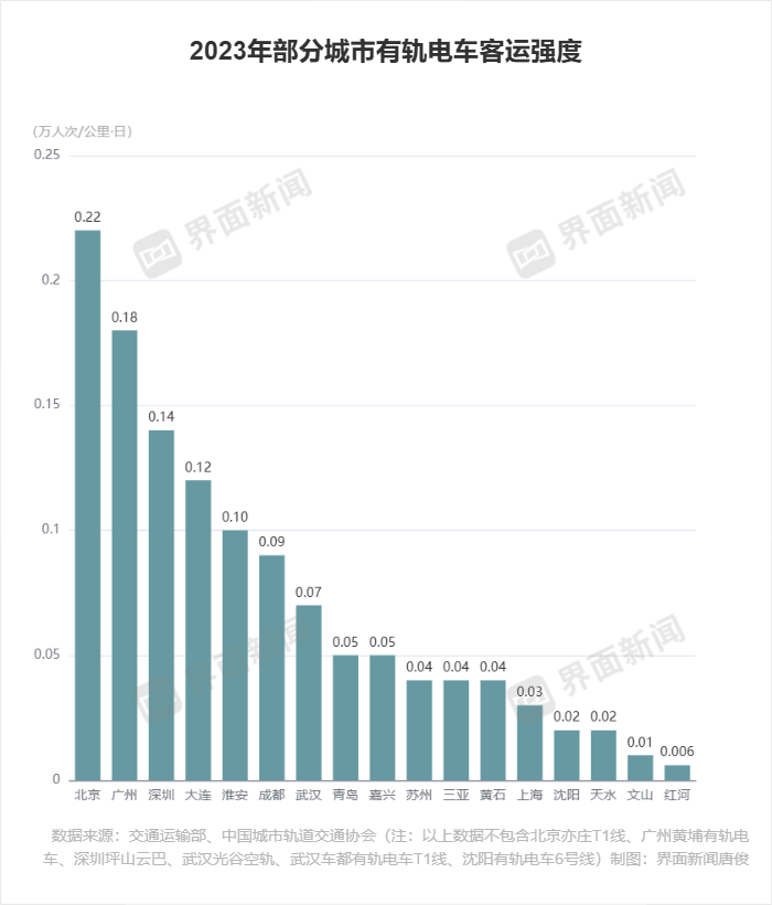 界面新闻从交通运输部和中国城轨协会查询到部分城市有轨电车的客流情况,已公布2023年客流数据的城市中,70%没有达到上述标准。即使是成都、武汉这样的超大城市,客流强度也低于0.1万人次/公里·日。而这还只是初期的客流强度要求,部分城市有轨电车已经开通多年,早已不是初期阶段。