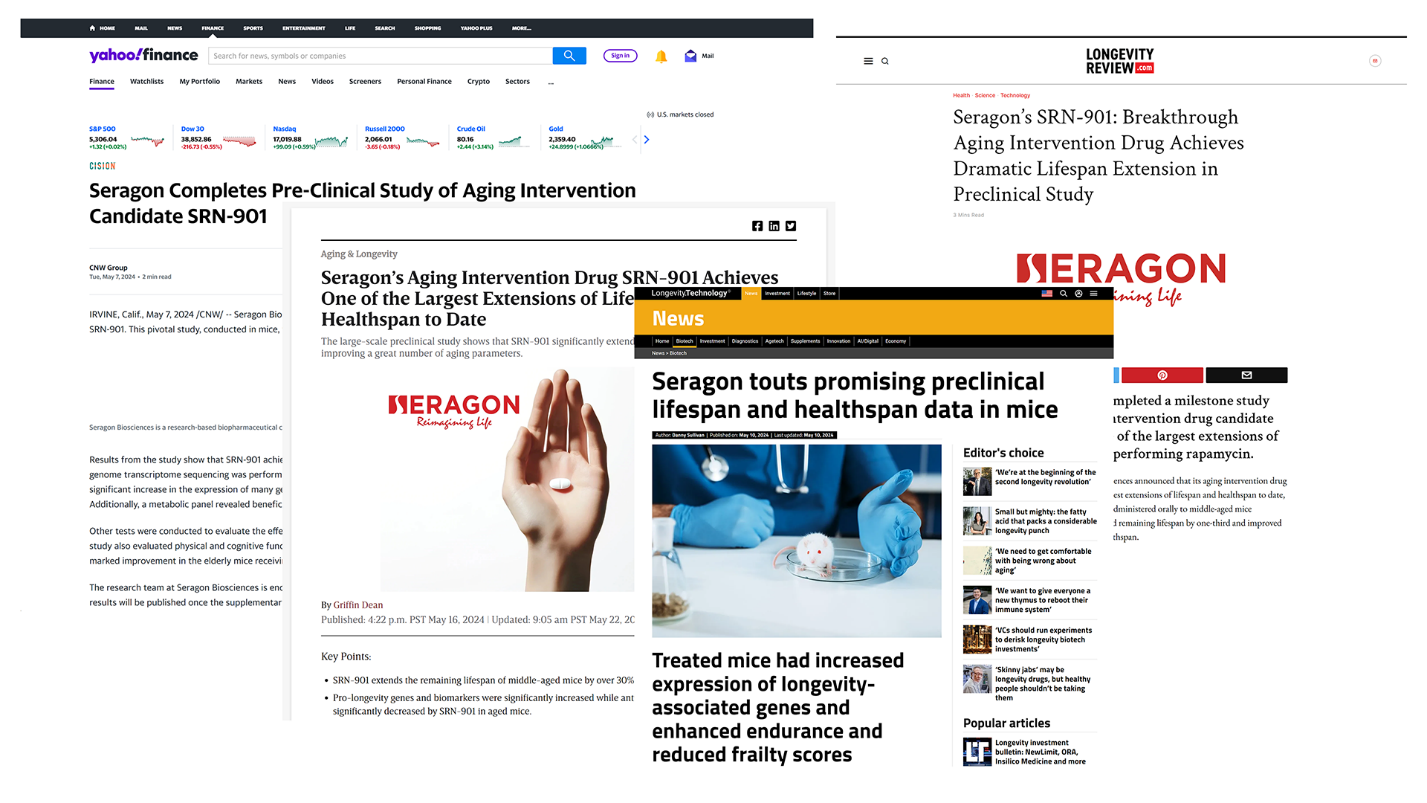 5月7日,在肿瘤治疗领域全球知名的原研药企赛诺根发布重磅公告:其管线中的第二款衰老干预候选药SRN-901初步完成临床前动物实验,并创下了目前口服衰老抑制剂的最高延寿幅度。