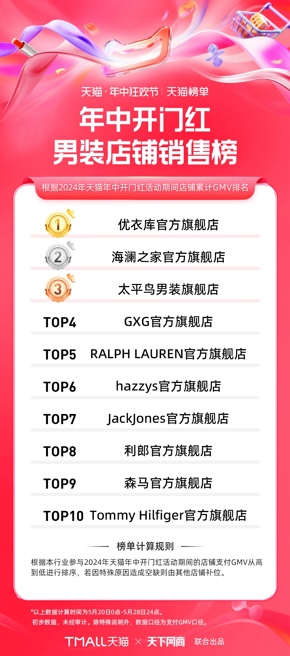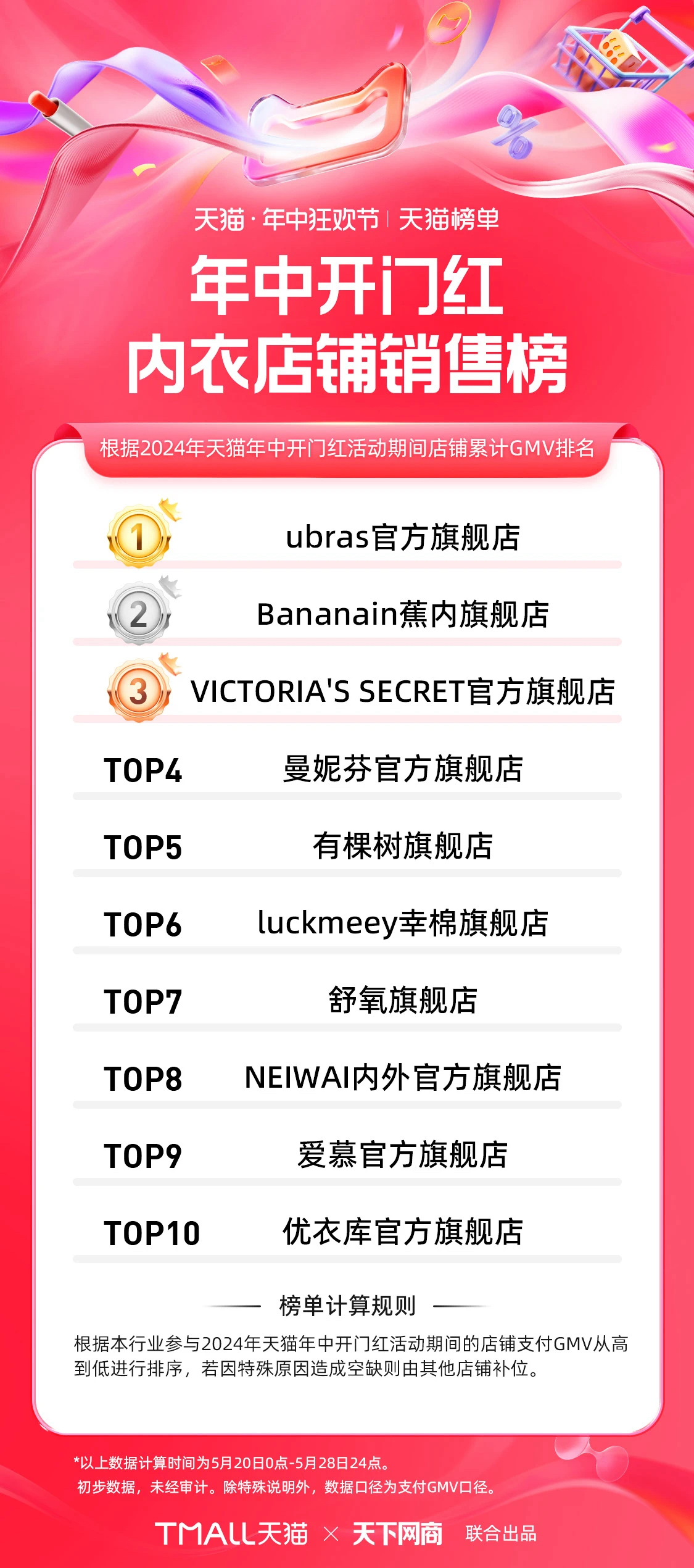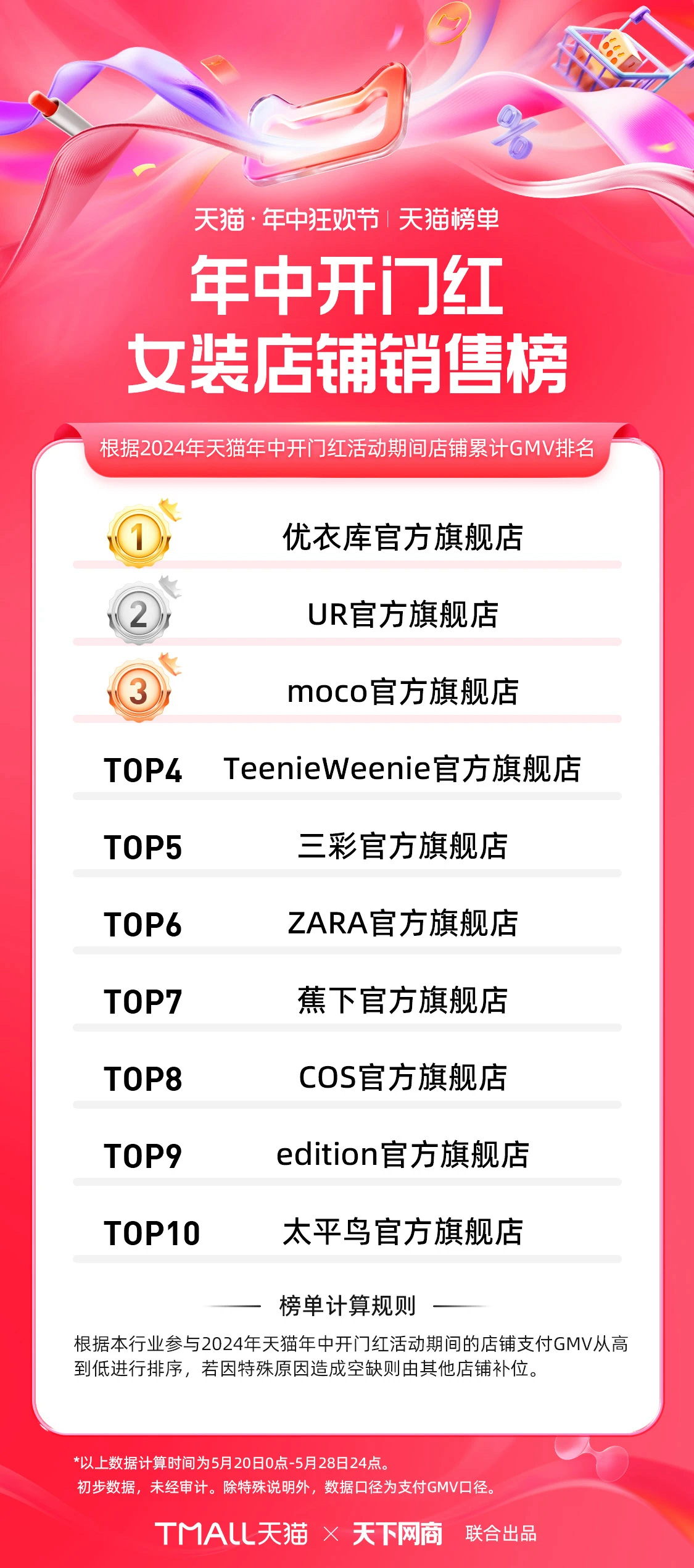 天猫率先在5月29日发布618第一波(5月20日至5月28日)销售额排行榜,公布了各领域前10名的品牌店铺。