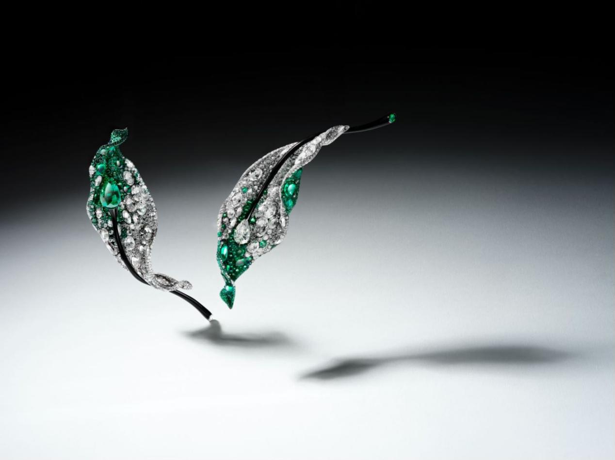 每件叶片上平均镶嵌1,500多颗宝石,在仅有1.77mm薄的钛金属上打造大幅度弯曲褶皱并全镶宝石,大师级工匠必须在20到60倍的显微放大镜下进行镶嵌,最终每一件镶满宝石的长叶胸针平均仅有22克,呈现出真实叶片的灵动轻薄。