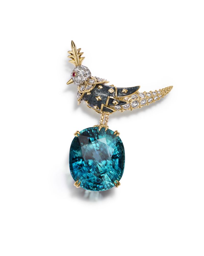 其中一款镶嵌一颗重逾100克拉海蓝宝石的Rainbow Bird on a Rock彩虹“石上鸟”胸针,从典藏设计中汲取灵感,采用微颤工艺镶嵌一颗水滴形绿松石。
