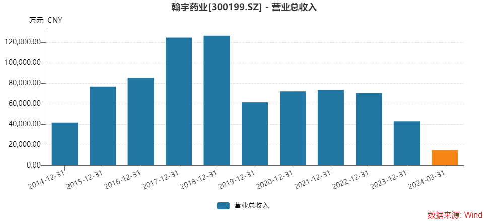翰宇药业是一家从事多肽药物研发、生产和销售的公司,但公司已多年业绩不佳。2018年至2024年一季度,共六年又一季期间,公司扣非归母净利润合计亏损32.26亿元;营业收入也由2018年的12.64亿元缩水至2023年的4.31亿元,少了三分之二。