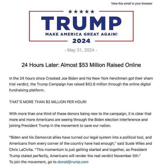 2024年5月31日,特朗普竞选团队发公告宣布,在特朗普被陪审团裁定“封口费”案罪名成立后的24小时内,团队募集了5280万美元(约合人民币3.82亿元)捐款,相当于每小时超过200万美元。这也刷新了共和党候选人网上募捐的纪录。