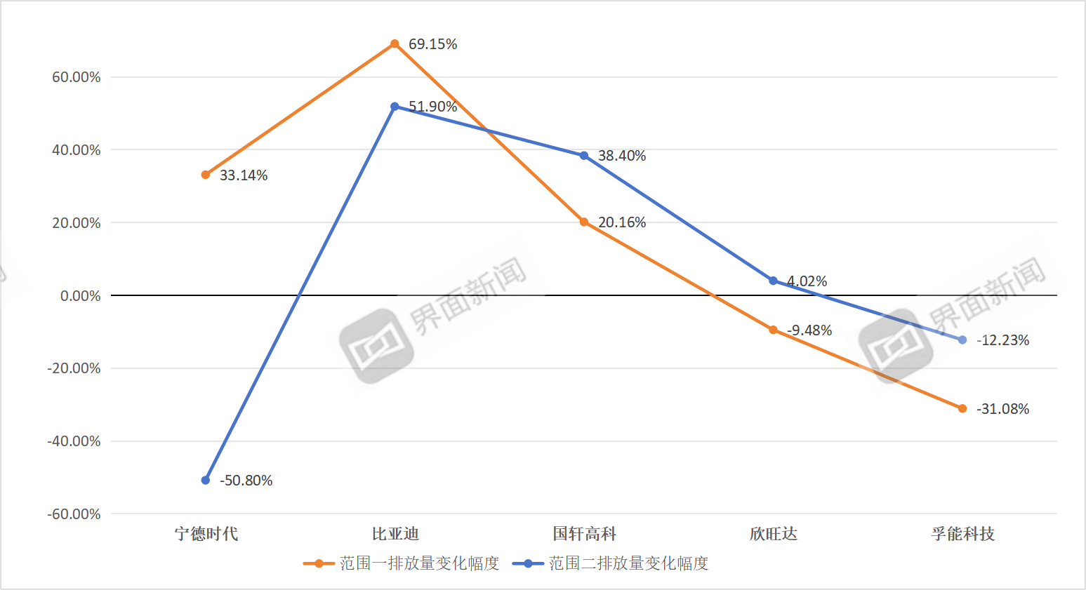 就增幅而言,上述企业中去年范围一和范围二排放同比增幅最大的都是比亚迪,分别增长了约69%和52%。孚能科技两项指标均呈现下降趋势。