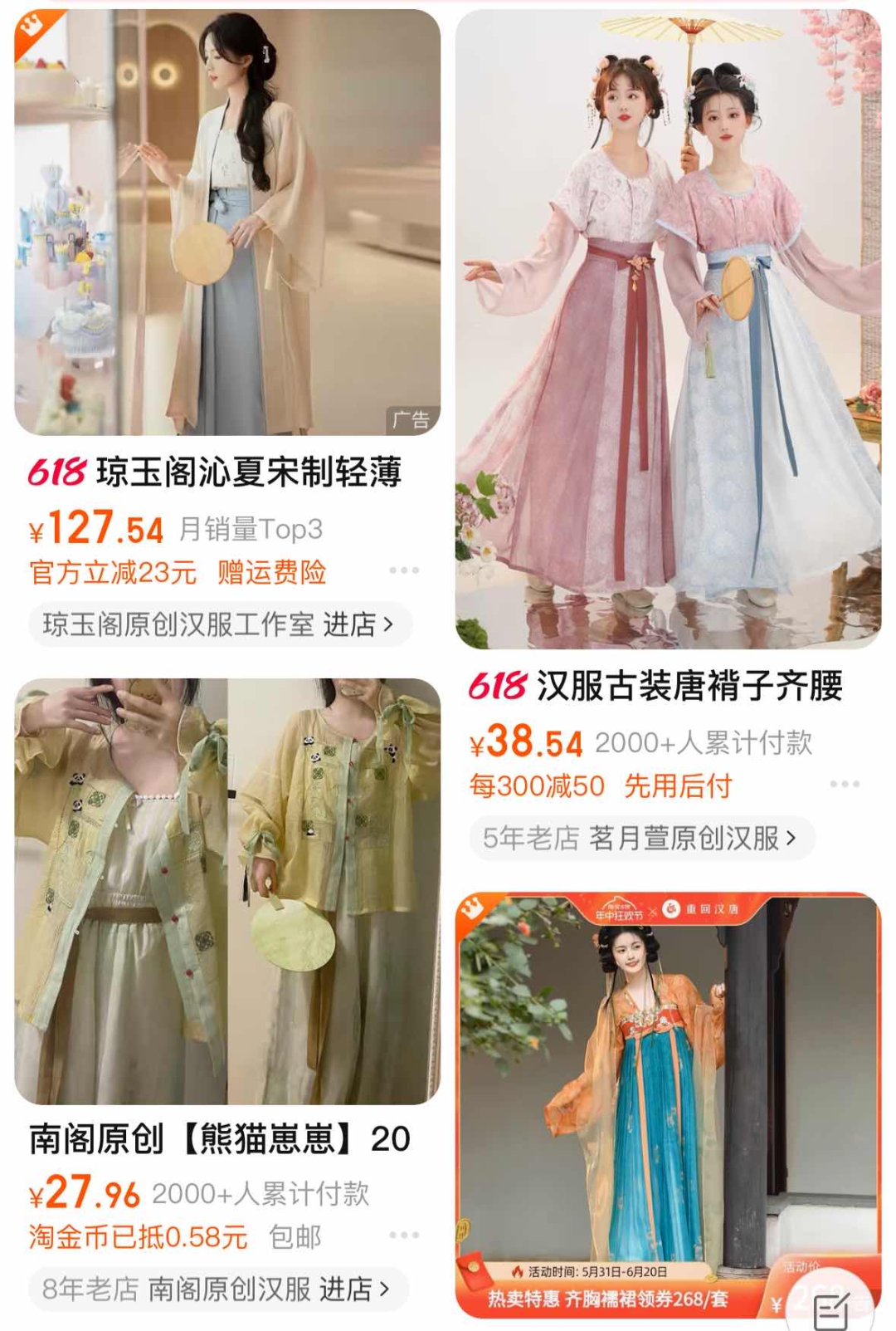 事实上,各平台的夏日款汉服销售火热:不久前,淘宝服饰联合南京博物院推出多款新中式、日常风的夏日汉服,部分单品迅速卖出1000件以上。早在五月初,抖音电商数据显示,平台上汉服销量同比增长389%;此前数据显示,京东平台选购汉服的00后用户数同比增长达143%。