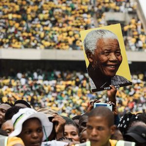 2024年2月24日,南非夸祖鲁-纳塔,在德班摩西·马比达体育场举行的非洲人国民大会选举宣言发布会上,非洲人国民大会(ANC)的支持者手持前总统纳尔逊·曼德拉的海报。图源:视觉中国