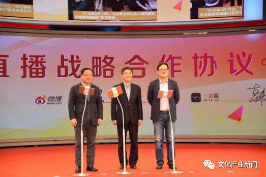 人民日报新媒体中心主任丁伟(中)、微博CEO王高飞(右)、一下科技创始人兼CEO韩坤(左)共同签约