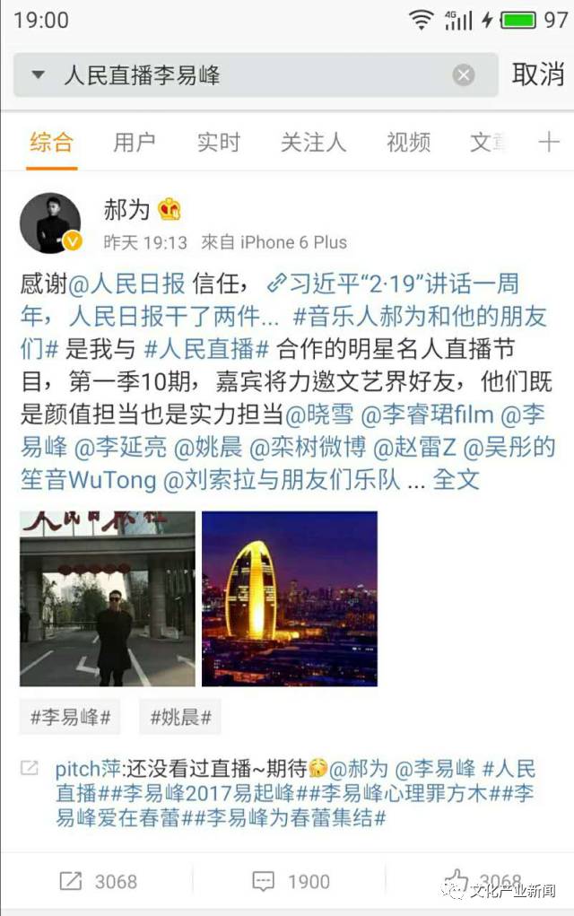 目前,除了已经有百余家媒体机构、政府机构、自媒体、名人明星等入驻“人民直播”平台,更有众明星携手入驻,特别是“小鲜肉”李易峰。在微博上输入“人民直播”便会自动跳出来后缀“李易峰”。有众多粉丝表示已搬好小板凳做吃瓜群众。