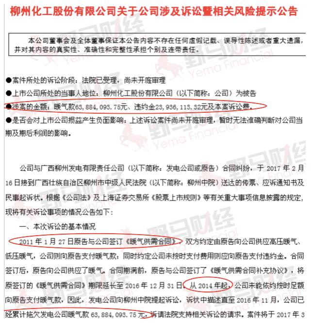 公司公告称,2011 年 1 月 27 日原告(发电公司)与柳化股份签订《暖气供需合同》,原告向公司供应了暖气。合同期满前,原告与公司签订了《暖气供需合同补充协议》,将原签订的《暖气供需合同》期限延长至 2016年12月31日。但是,从2014年起,柳化股份就未能依约按时足额向原告支付暖气款,因此,发电公司向柳州中院提起诉讼,诉状中称,柳化股份已经累计拖欠发电公司暖气款 6388.41万元。据披露,该案件将于2017年3月29日开庭审理。