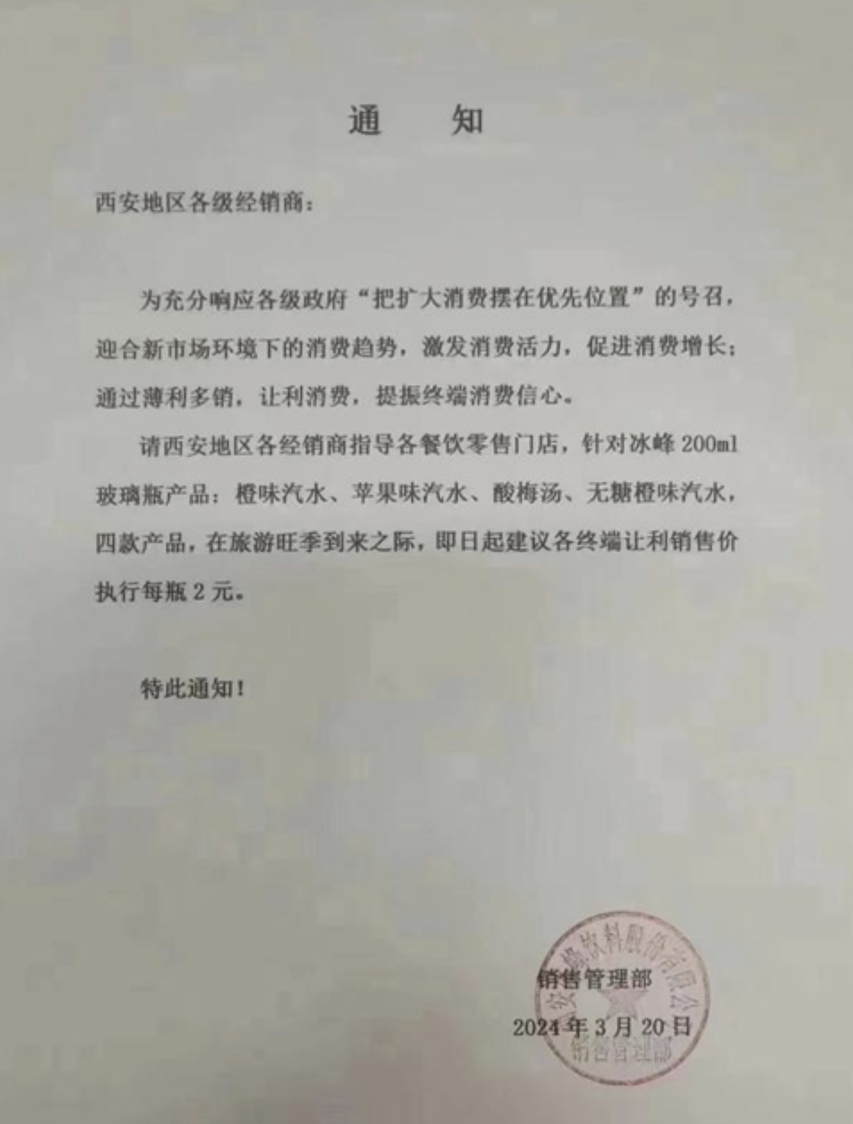 此前,一张盖有“西安冰峰饮料股份有限公司销售管理部”印章的通知被曝光,该通知称,建议西安地区各经销商在旅游旺季到来前,指导各餐饮零售门店对玻璃瓶装的橙味汽水等多款产品降价至每瓶2元,理由是“响应政府的扩大消费号召,促进消费活力,薄利多销”,落款时间为2024年3月20日。