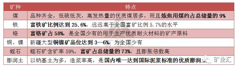 新疆富矿比例较高,煤炭低硫低灰,富铁矿比例更是高出全国平均水平5倍,而且新疆拥有一批特色矿产,如新疆和田玉、钠硝石、皂石、水硝碱镁钒、蛋白土等。