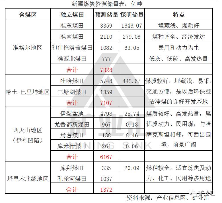 煤炭:煤炭是新疆最具优势的矿产资源之一,资源总量预测约为2.2万亿吨,占全国的40%,居全国之冠。