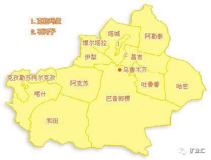 金矿:新疆的黄金资源比较丰富,境内探明储量主要集中分布在阿尔泰山、东西准噶尔界山、天山及西昆仑一阿尔金山等地。虽然全疆87个市县几乎都有分布,但总储量的90%金矿集中在阿勒泰,伊犁,吐鲁番,塔城和哈密地区.分布极不平衡。
