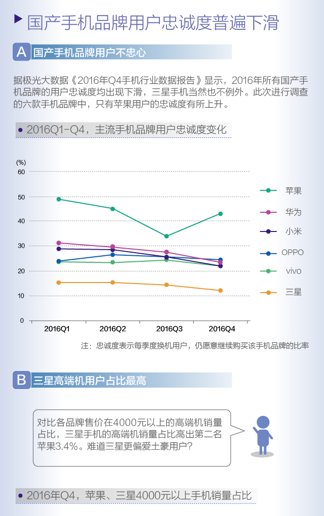 2017年2月,极光大数据发布《国产双星的崛起——2016年Q4手机行业数据报告》,数据表明国产手机品牌在“热卖”的当口,用户忠诚度却不甚理想。品牌销量上,华为Q4总销量市场占比18%,斩获第四季度销量王。机型销量上,OPPO旗下明星机型OPPO R9连续三个季度蝉联销量冠军,四季度销量占比6.1%。不过就整体手机市场的保有率而言,苹果仍盘踞行业“老大”之位。