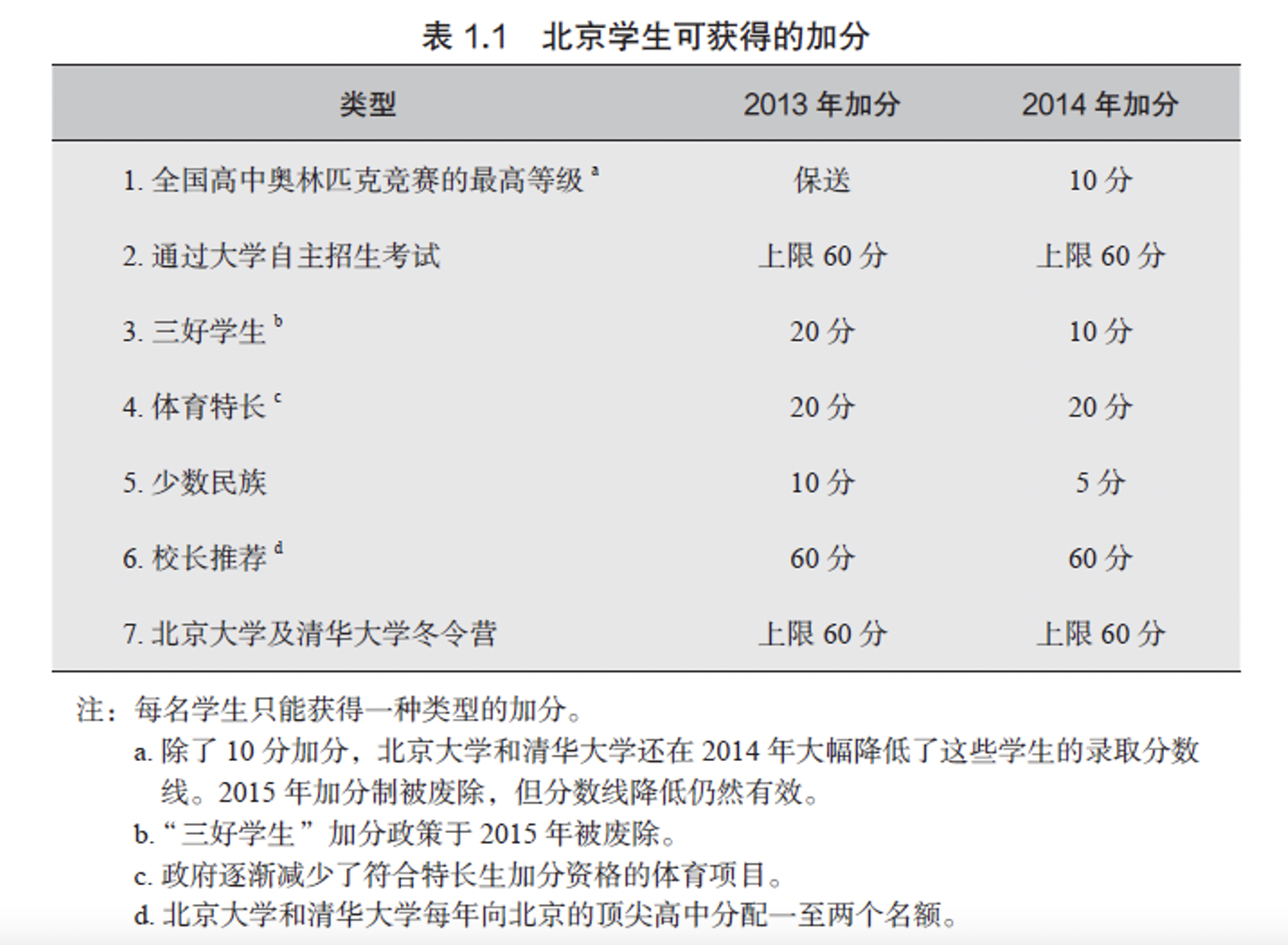 放眼世界,高风险考试往往是直接而易于理解的—高分者进入更好的学校。在这一点上,高考也不例外。然而,北京的高考结构还包括一系列特殊情况,可能影响学生的录取结果,需要谨慎应对。在我田野考察期间(2013年至2014年),一种特殊情况是高考加分制度。部分学生可以直接获得高考成绩的加分,而且有多种获得加分的方式,但每名学生只能择其一。表1.1列出了2013年和2014年可选的加分项目。除了少数民族外,要获得加分都需要花费学生大量时间。学生最少要花6个月准备各大学组织的自主招生考试,而若选择高中奥赛,则要准备两年之久。此外,如表1.1所示,加分方式和预期收益经常遭遇临时变动。2014年,在奥赛开始前的两个月,政府突然宣布,全国中学生奥林匹克竞赛的金牌获得者将不再自动获得保送大学的资格。这一消息彻底将于朗压垮,她花了整整两年准备竞赛,为此牺牲了准备高考的时间。同年,首都中学的丽丽告诉我,她的梦校在自主招生前几个月突然取消了考试,看到通知她差点哭了出来。