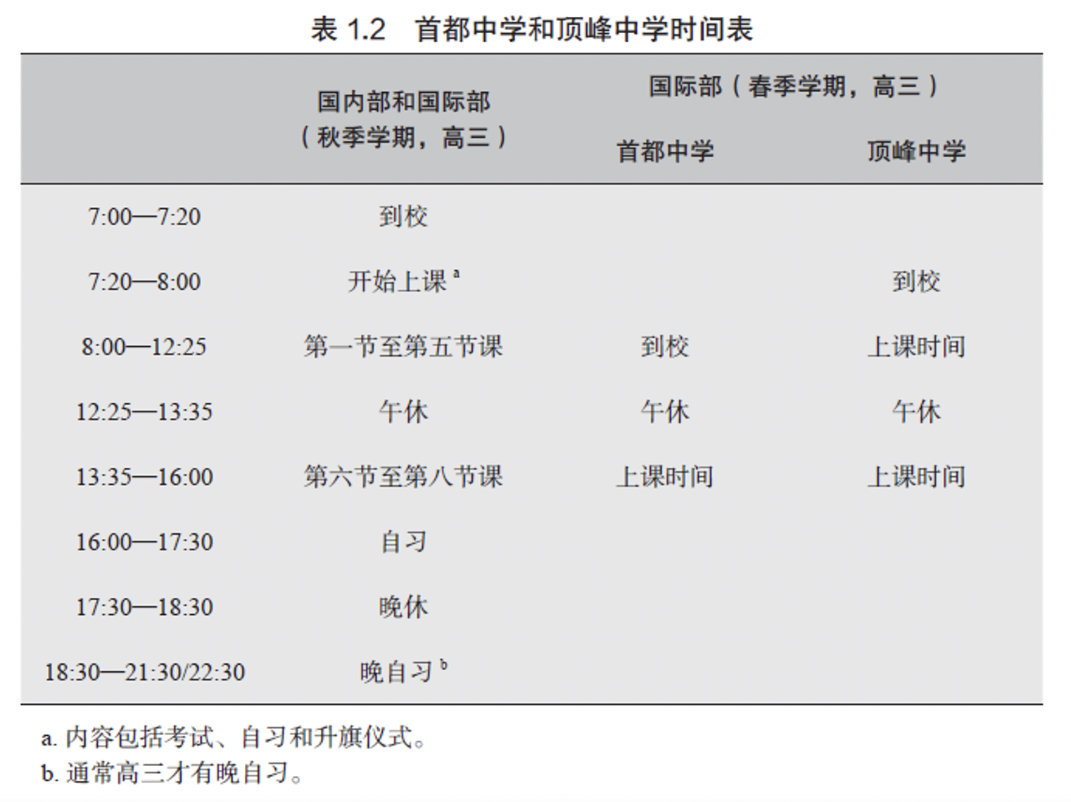 全天的课程于五点半结束,学生们可以回家吃晚饭。几乎所有高三生都会在一个小时内返回学校开始晚自习,老师则在走廊巡逻。学校非常重视晚自习,老师们声称晚自习的效果直接与高考成绩相关,也会在家长会上通报晚自习情况。学生们可以自行决定学到几点,但几乎所有人都在晚上九点半到十点半之间离开。一天结束时,学生疲惫地拖着脚步朝前门走去,十五小时前,他们从这里走进教室。回家后,他们会继续学习,通常在十一点到半夜两点之间上床睡觉(表1.2列出了国内部的学生日程表)。周末的学习任务就更重了,许多高三生因为压力大,整个周末都会穿着校服在学校自习,早上九点到校,晚上九点左右离开。周末的自习与晚自习类似,老师会在校园里巡逻,学生们安静地学习,铃声照常打响,与平日一样。学生们每天在校度过十二到十五个小时,几乎没有时间接受任何形式的课外辅导、补习或影子教育。