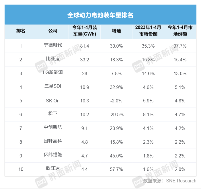 今年前4个月,宁德时代(300750.SZ)动力电池装车量达81.4 GWh,同比增长30%,市场份额达37.7%,为全球唯一一家市占率超30%的电池制造商,稳居榜首。
