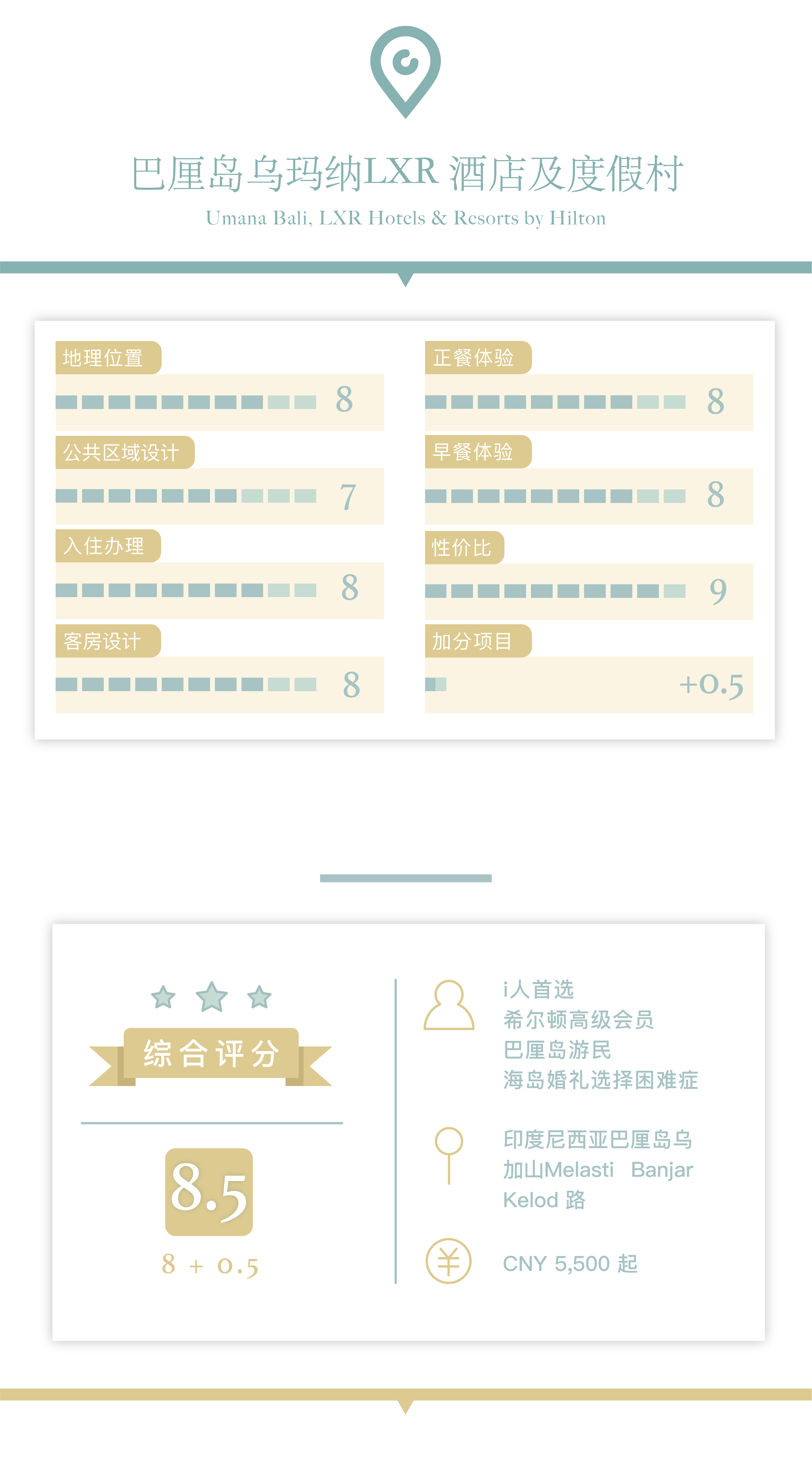 此行酒店名为“巴厘岛乌玛纳,LXR 酒店及度假村”(后文简称巴厘岛乌玛纳)。属于希尔顿酒店集团旗下的奢华酒店类软品牌,所谓软品牌的特点就是酒店大都各具特色,拥有自己的独特故事和背景,既能够共享大型酒店集团的会员体系和相关资源,又拥有更多酒店设计和经营的自主权。同样类似的还有万豪国际的豪华精选、洲际酒店旗下的洲至奢选,以及凯悦集团的凯悦臻选等等。目前 LXR 品牌在全球拥有超过22家酒店及度假村。