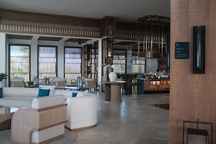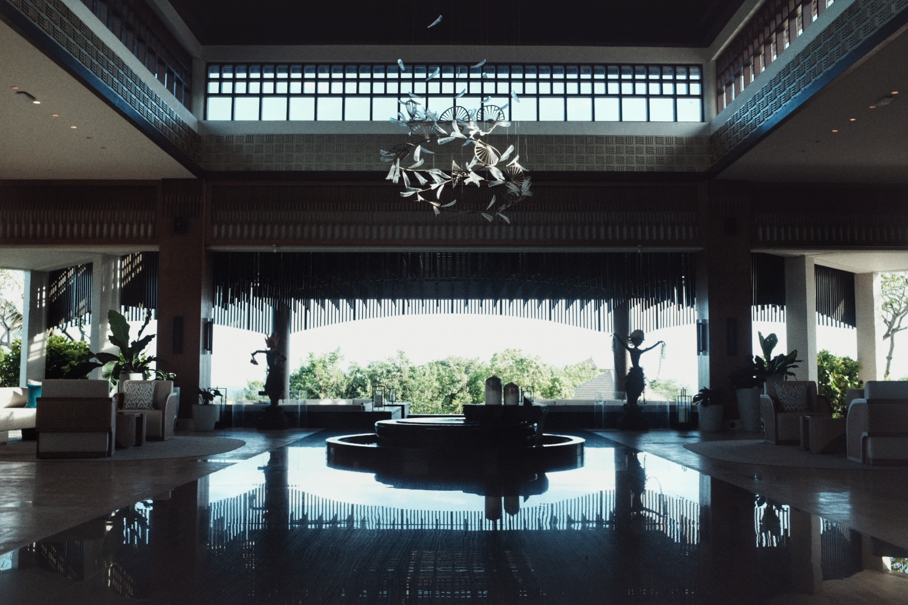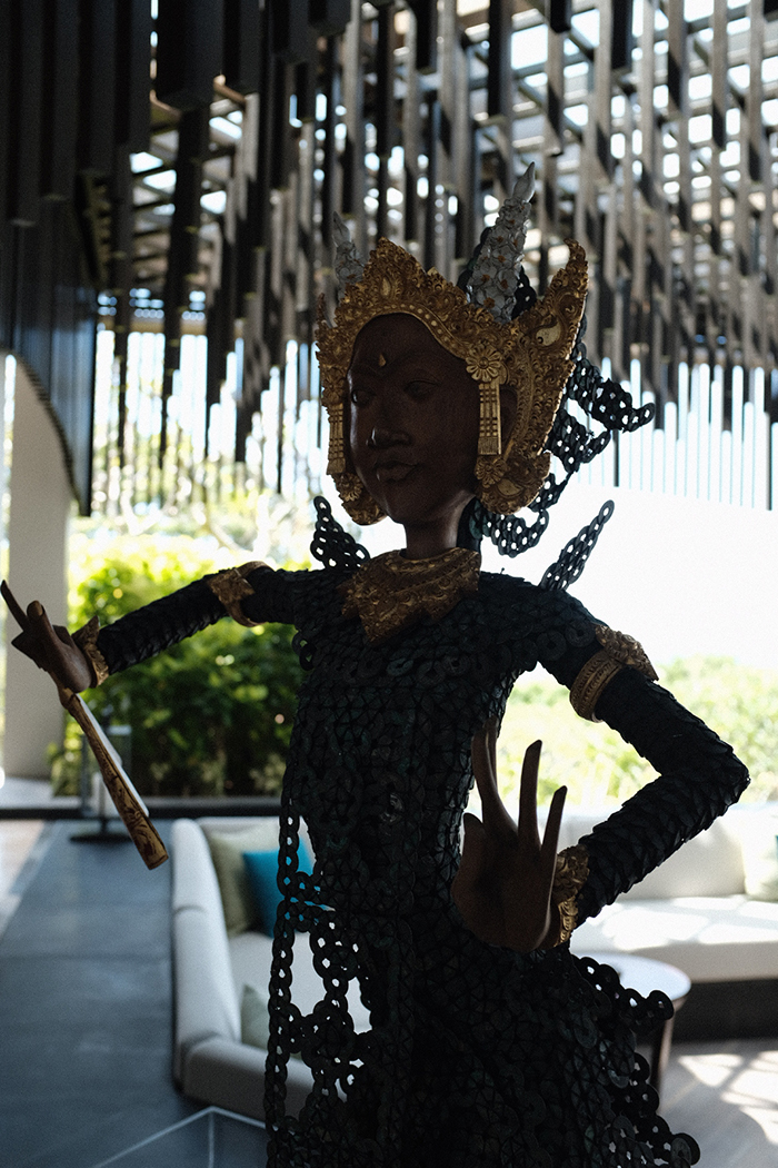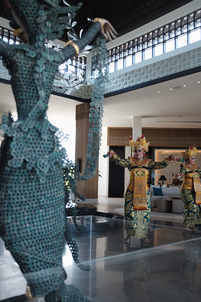 酒店设计汇聚了祭礼、社区及自然等巴厘岛本土元素。大堂视野宽阔,可以一览酒店全貌以及远眺印度洋,大堂有一盏引人注目的现代风格吊灯在天花板正中,据介绍这件吊灯是对当地传统舞蹈雷贡舞(Legong Keraton)的视觉诠释,在形状上,用有机形状的金属环和扇子反映舞者流畅的动作,灯的主体使用了约100片手工吹制的玻璃花瓣。大堂两边还有两尊巴厘岛舞者的古董雕像,由真品Kepeng Coin(中国古代外圆内方的铜钱,曾在7世纪和8世纪被用作货币)制成,表演者在此更能映射出传统文化的魅力。