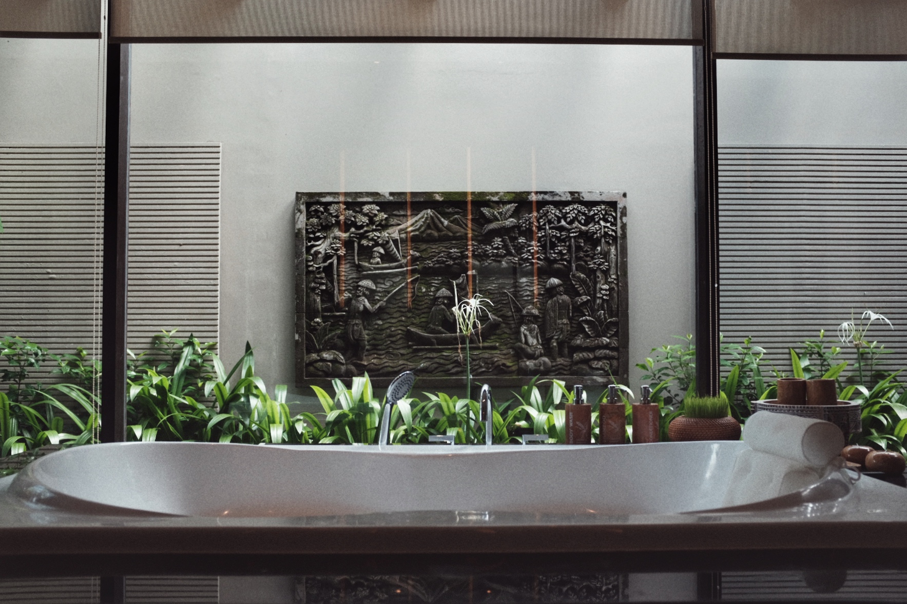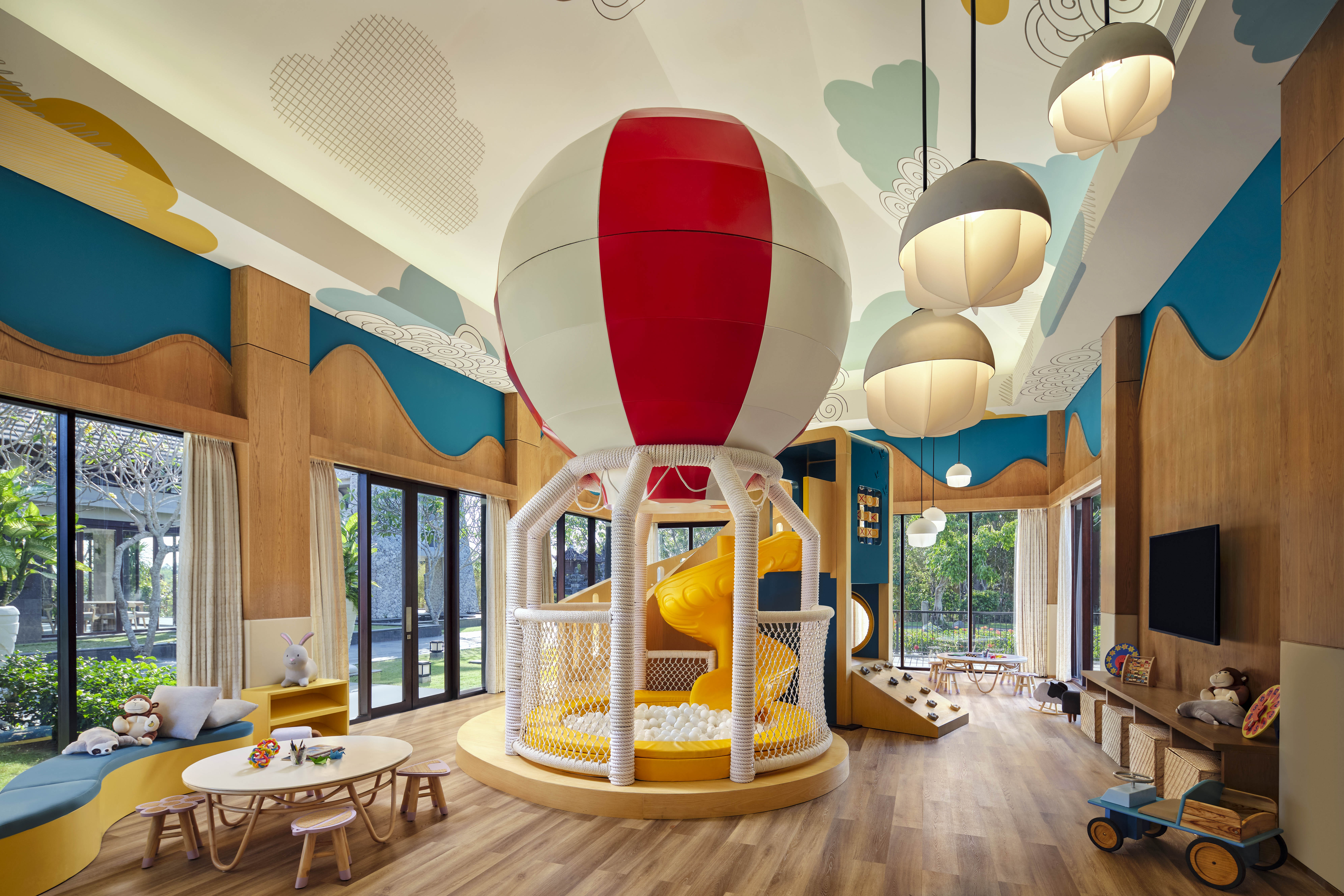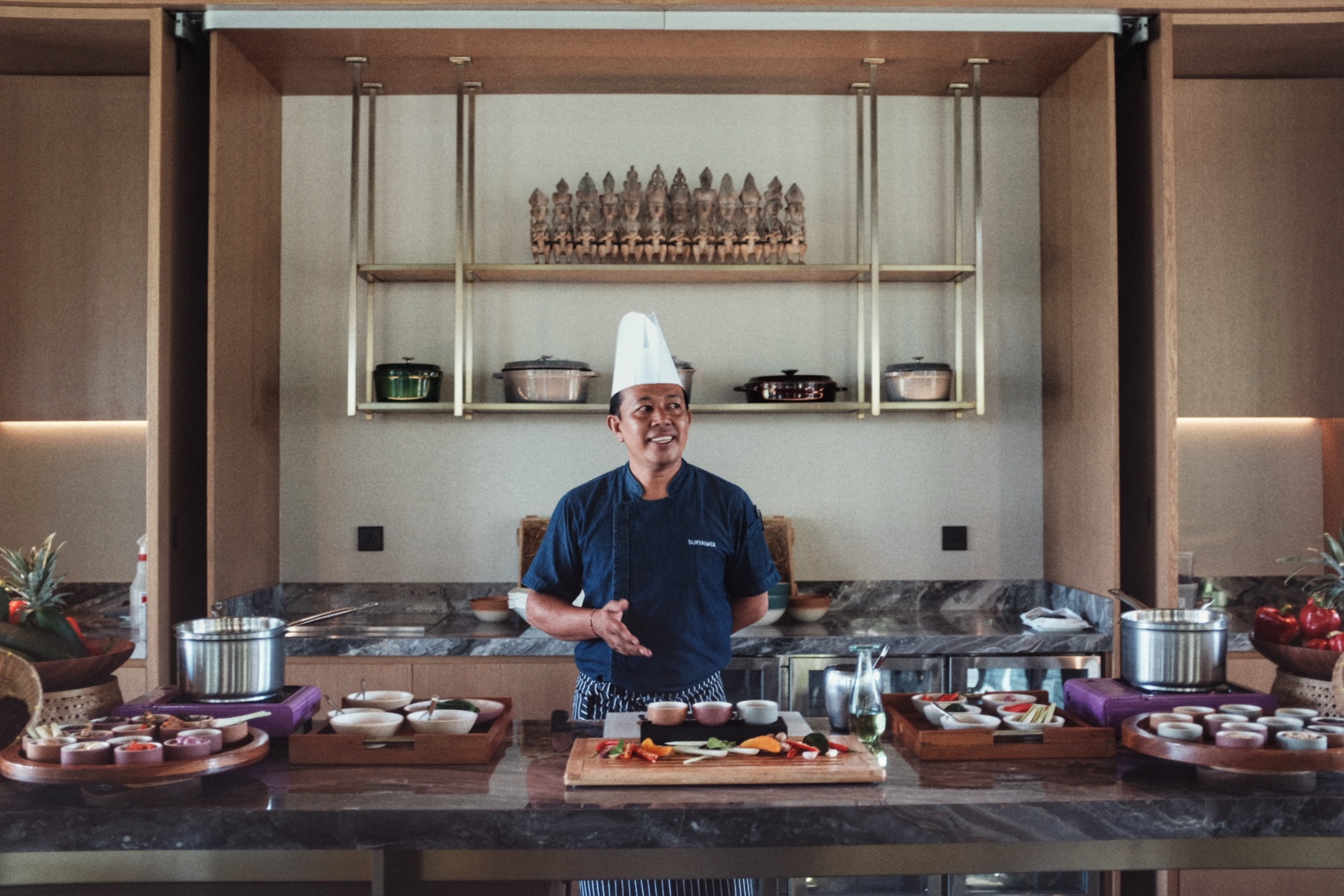 酒店设计汇聚了祭礼、社区及自然等巴厘岛本土元素。大堂视野宽阔,可以一览酒店全貌以及远眺印度洋,大堂有一盏引人注目的现代风格吊灯在天花板正中,据介绍这件吊灯是对当地传统舞蹈雷贡舞(Legong Keraton)的视觉诠释,在形状上,用有机形状的金属环和扇子反映舞者流畅的动作,灯的主体使用了约100片手工吹制的玻璃花瓣。大堂两边还有两尊巴厘岛舞者的古董雕像,由真品Kepeng Coin(中国古代外圆内方的铜钱,曾在7世纪和8世纪被用作货币)制成,表演者在此更能映射出传统文化的魅力。