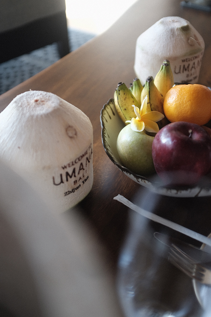 东航上海直飞巴厘岛的时间其实不是很理想,每天一班,晚上六点起飞,等落地出关也接近凌晨一点,到达酒店也快要凌晨两点左右了。不过即便如此,酒店依然准备了欢迎礼遇,菠萝味饮料以及对应大堂雕像的Kepeng Coin手绳。管家会开着Buggy一路指引你到房间,介绍每一个室内室外的设施,也提醒你要关好门窗,注意野生动物和昆虫。客房内的欢迎礼有香槟、新鲜椰子以及不甜的马卡龙饼干。