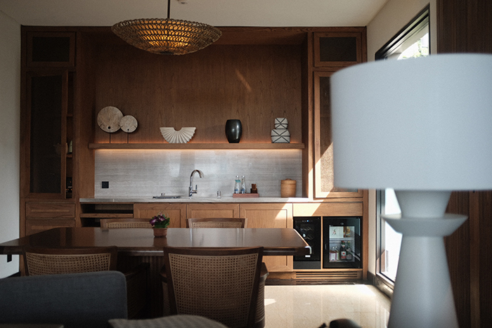 酒店拥有72栋独栋别墅,设计理念是依照巴厘岛苏巴克系统(Subak systerm)为基础,是一种将水稻梯田灌溉与自然以及神灵联系起来的传统方法。每栋别墅都以古老的乌马稻田为灵感来源,别墅内饰设计摩登现代,采用大理石、木材和混凝土等天然材料,以中性和海军蓝为主色调,配备私人无边泳池、室外热水按摩泡池缸以及室内外淋浴间。别墅面积从 403 平方米起,玄关通主卧,也能穿过直达泳池区。室内客厅就分为休闲区、办公区以及用餐区,主卧空间适中,打开落地窗就能直接跳入无边泳池(不过要小心野生猴子),卫生间空间超大。