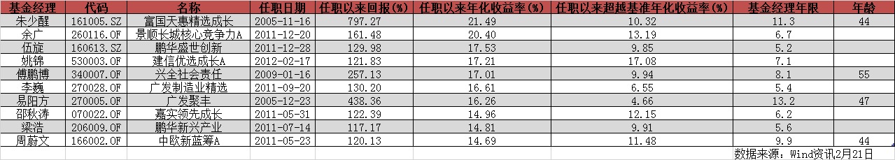 上表中基金经理平均任职年限为7.9年,有数据显示的年龄都在44-55岁之间。年化收益最高达21.49%,最少也近15%。超越基准收益率平均值为10.51%。从这些指标来看,老司机们管理的基金可以打上“长牛基金”的标签了。