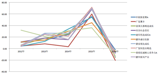 可以看到,2015年是这些基金的收益巅峰,优秀的年化收益也有赖于这一年的积累,从而拔高整体收益水平。遗憾的是,在2015年集体冲刺到基金收益的巅峰之后,2016年全部下滑至负收益区间,无一幸免。而在2015年之间,这些基金全部取得正收益。