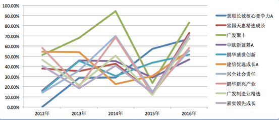 那么,如果按照排名来买基金会出现什么结果呢?我们将上述基金过去五年的排名变化制作如下图: