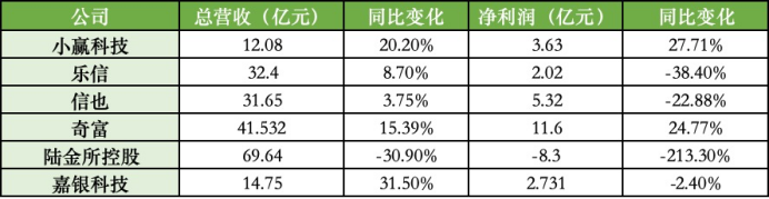 小赢科技、乐信、信也科技、嘉银科技分别实现利润分别为3.63亿元、2.02亿元、5.32亿元、2.731亿元,不及奇富科技同期实现净利润一半,其在报告期内实现净利润11.6亿元;