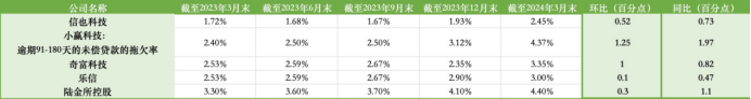 截至2024年3月31日,信也科技、小赢科技、乐信、奇富科技以及陆金所控股90天+逾期率同比与环比均有所增长。