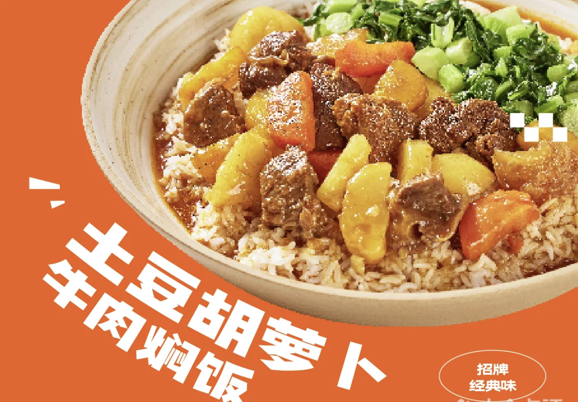 正如招牌上突出的名称,从产品上看,该新品牌主打土豆胡萝卜牛肉焖饭、泰式咖喱牛肉焖饭等经典盖浇饭,以及辣皮子牛肉拌面等,大众点评平台包含饮料的套餐价格在35.9-38.9元不等。从一些主要产品配料、口味来看,焖饭与拌面和之前的小锅牛肉有类似之处,这也匹配了西贝的供应链。